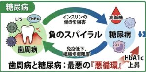 全身疾患の中でも、最も歯周病との関連が深く、かつ恐ろしいのが「糖尿病」です。この二つは単に関連があるだけでなく、「負のスパイラル」を形成しています。