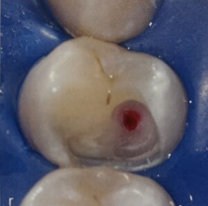 歯の神経はどのような見た目なのか想像できないと思います。下の写真のように、神経が生きている場合は出血があります。このような場合に直接覆髄を選択できる可能性があります。