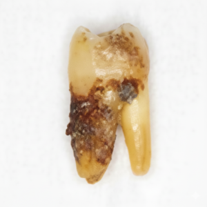 SRPは、この**「諸悪の根源」を徹底的に取り除く方法**なのです。下の写真は歯周病により抜歯した歯ですが、びっしりと縁下歯石が付いています。