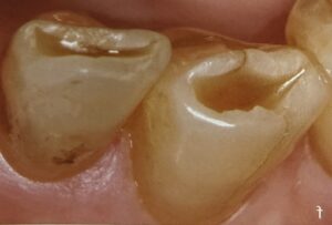 下の画像のような大きな穴が空いていると虫歯に見えますよね?これは酸蝕症の1例ですが、もっと大きな穴が空いたり、歯が元の半分ほどの長さまですり減ってしまっているケースも見られます。