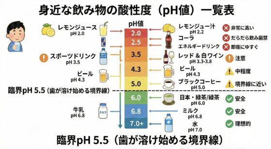 炭酸飲料やスポーツドリンク:コーラなど炭酸飲料はpH 2.2前後と非常に強い酸性です。見落としがちですが、炭酸でないスポーツドリンク等の清涼飲料水も要注意です。